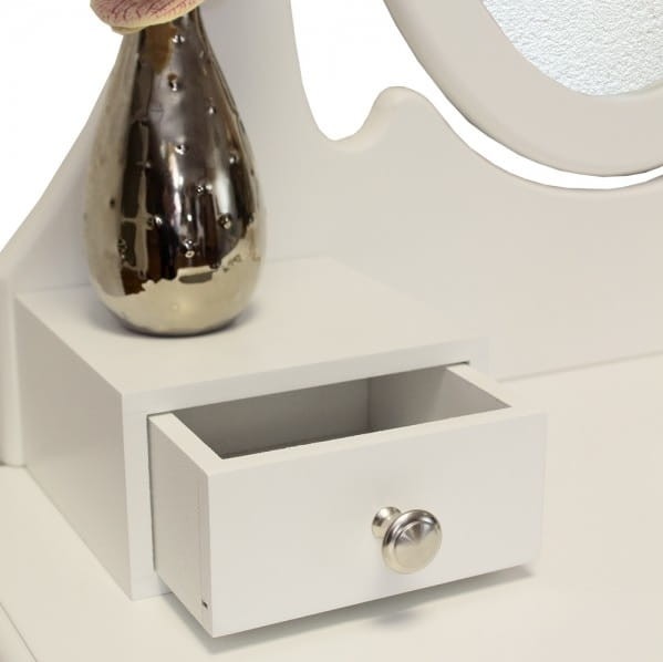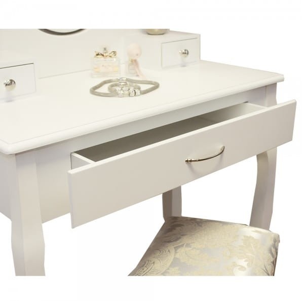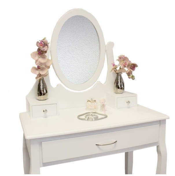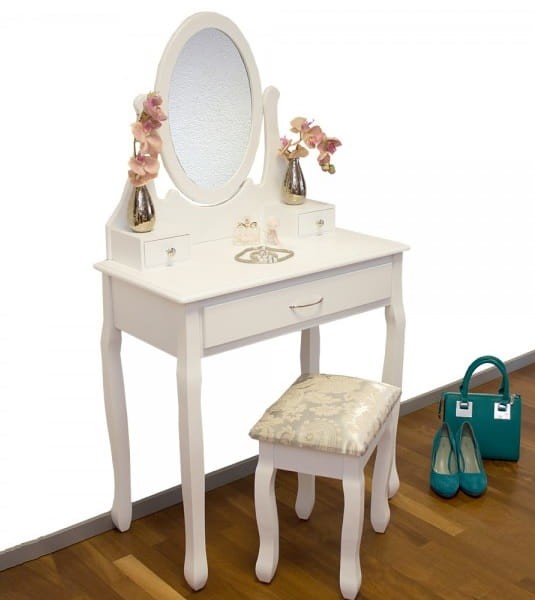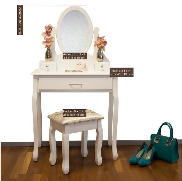 Toaleta jest idealnym miejscem, aby wykonać poranny makijaż na cały dzień. Ruchome lustro ułatwia nam tą czynność, a w trzech szufladach znajdzie się miejsce na wszystkie Twoje produkty do stylizacji, takie jak biżuteria, szminki i inne kosmetyki w jednym miejscu i stworzyć porządek w sypialni. Nie ma już potrzeby, aby szukać już wszystkie produkty, a tym samym zaoszczędzić sporo czasu.. Wygodny taboret ułatwia wygodną stylizacji i nie trzeba już stać w podczas malowania twarzy.