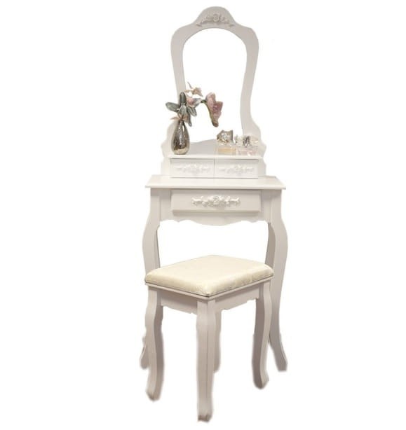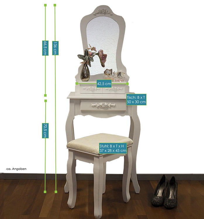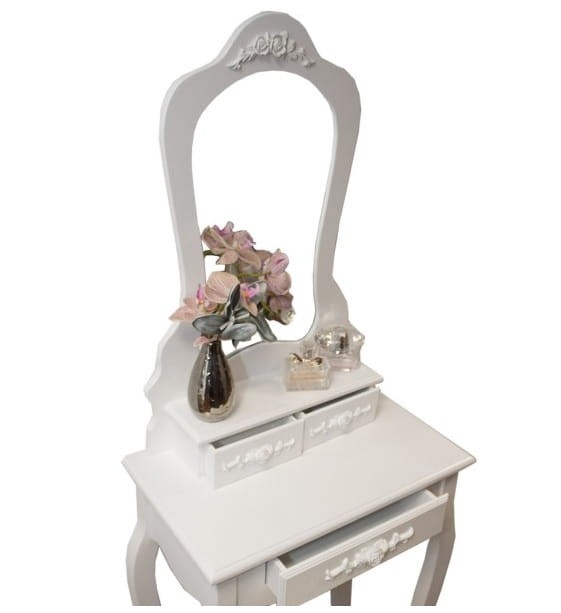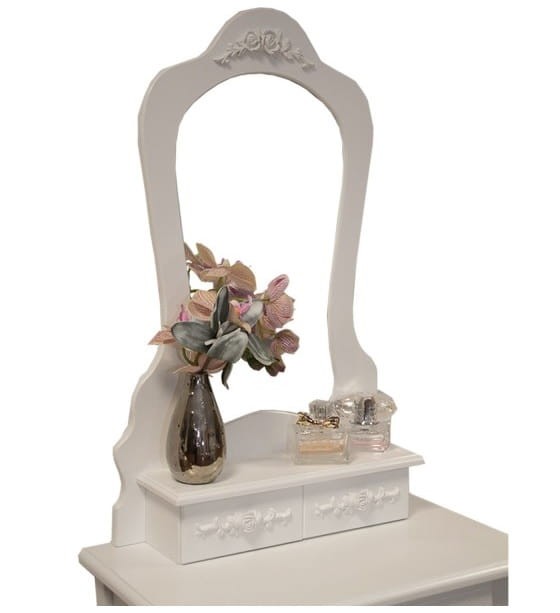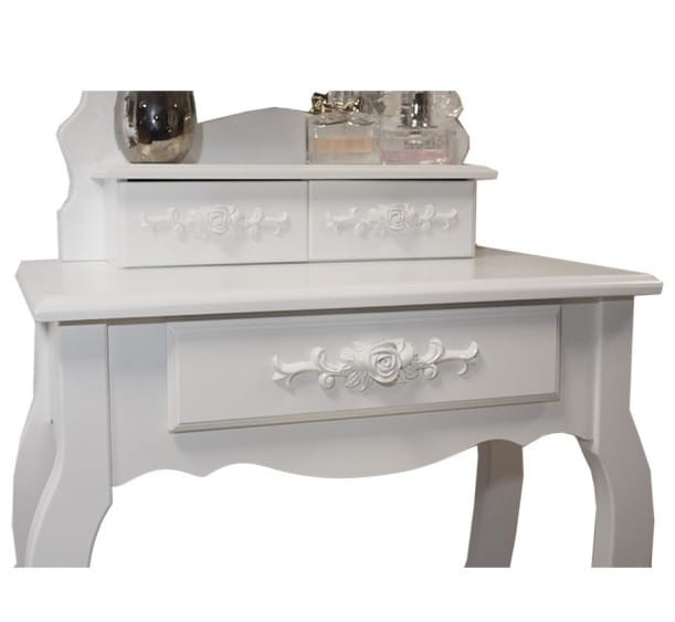 Stół do makijażu 105 jest w całości utrzymany w eleganckim, starodawnym stylu. Nawet na pierwszy rzut oka widać, że wiele uwagi poświęcono dbałości o szczegóły. Jego przejrzyste i zakrzywione kształty oraz umiejętnie rozmieszczone akcenty sprawiają, że ten mebel staje się absolutną atrakcją Twojej sypialni. Tapicerka jest celowo utrzymana w romantycznym stylu. Ten kosmetyczny stół przekonuje nie tylko pięknym wyglądem, ale oferuje również optymalną funkcjonalność. W konsoli znajdziesz dużą szufladę, w której możesz schować swoje kosmetyki.